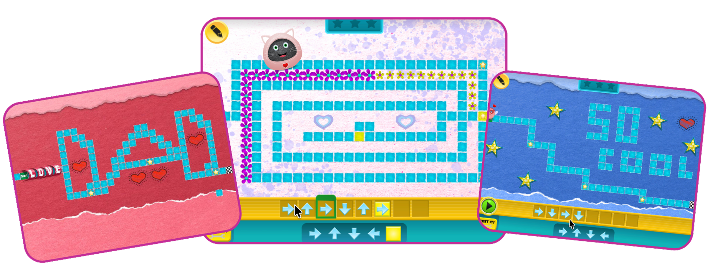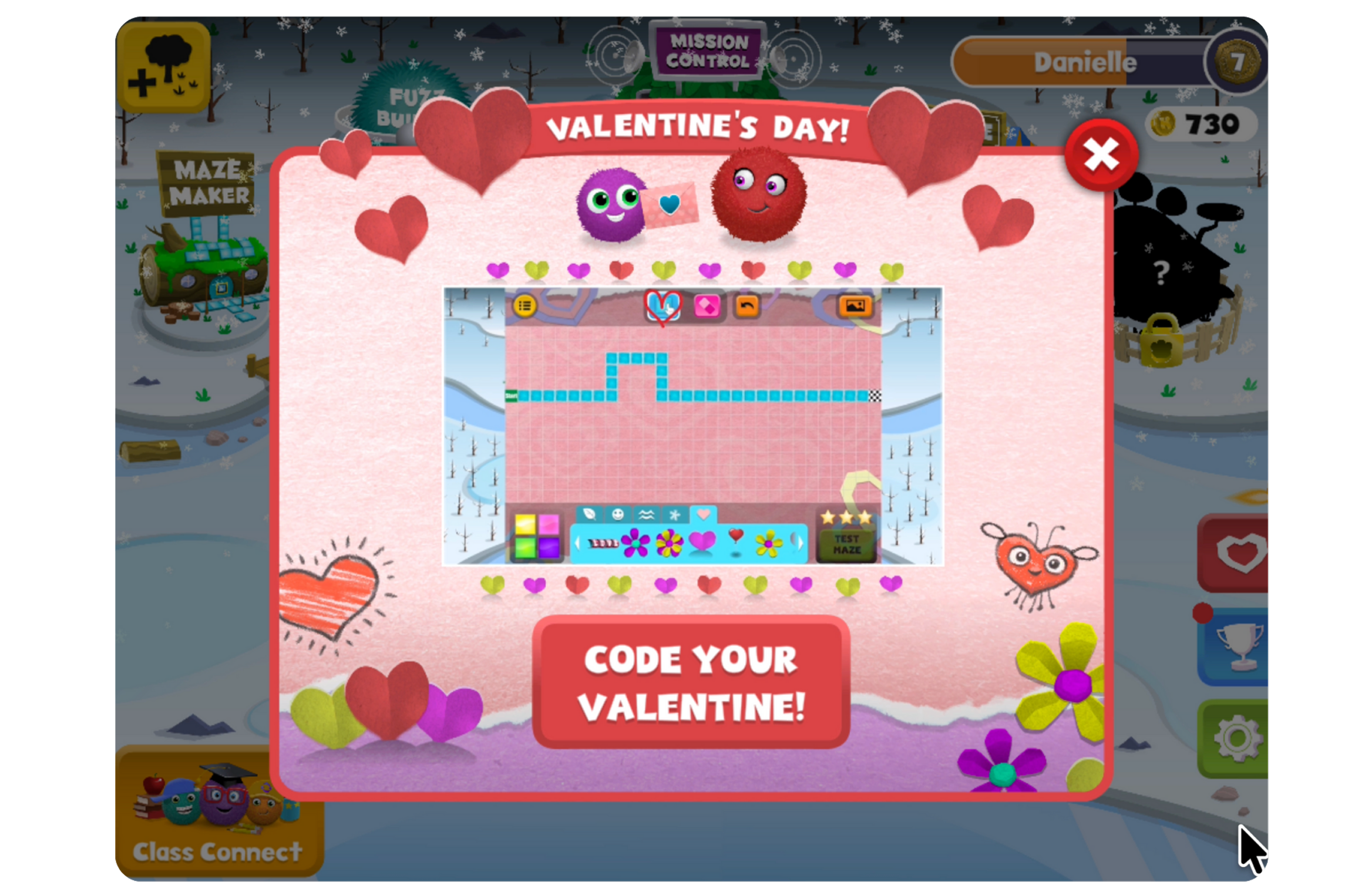 After completing one maze in the event, students will unlock six Valentine-themed costumes and accessories. They can then visit Fuzz Builder to code and customize new Fuzzes!